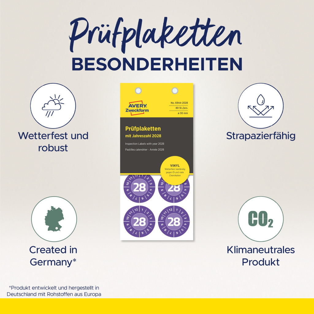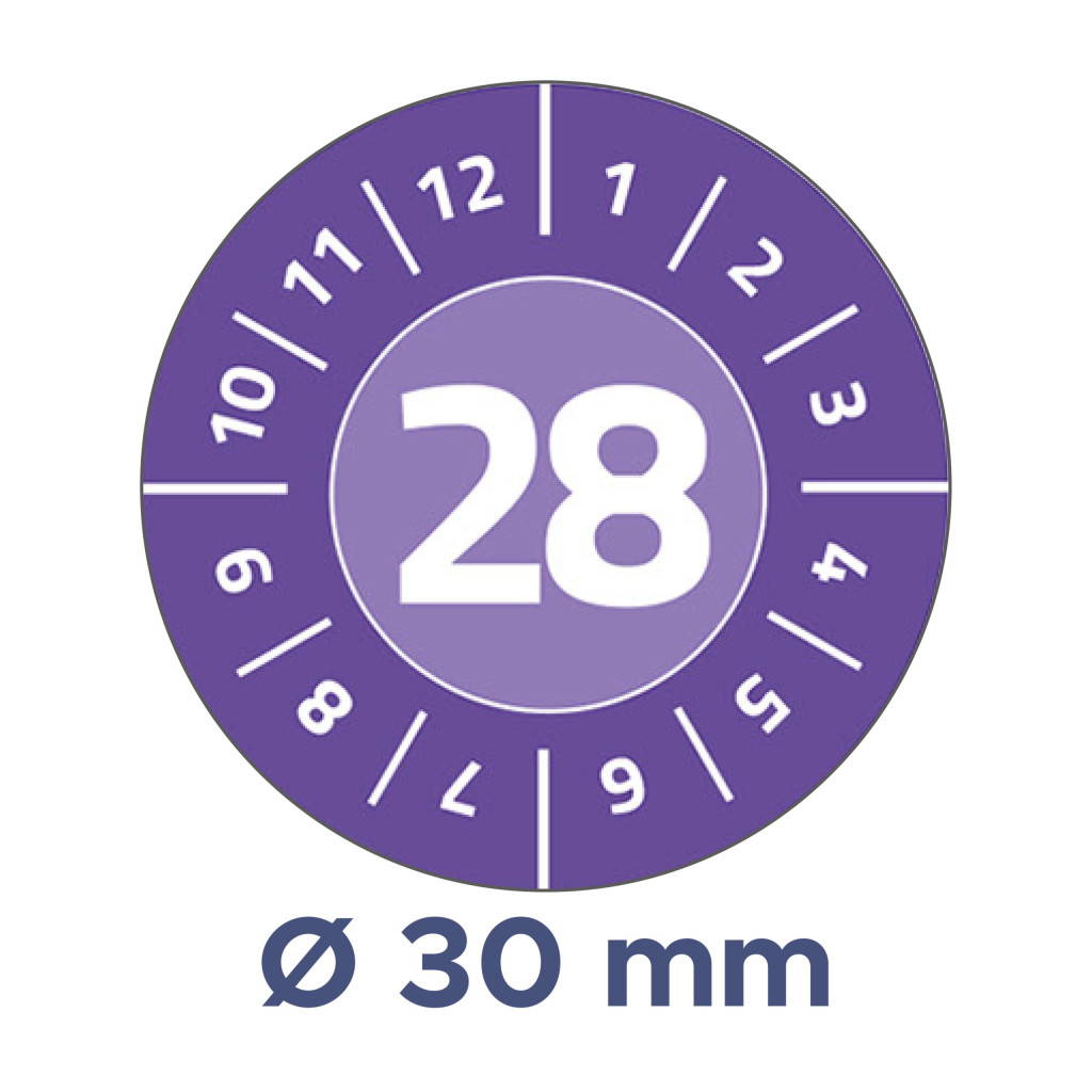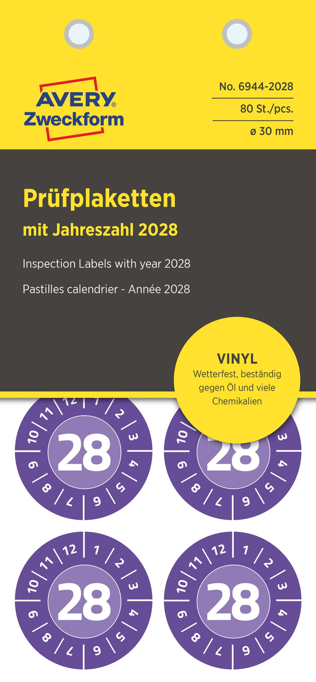 Avery Zweckform No. 6944-2028 ibolyakék színű 30 mm átmérőjű öntapadós időjárásálló felülvizsgálati címke 2028-as évszámmal 12 hónapos beosztással - 80 címke / csomag