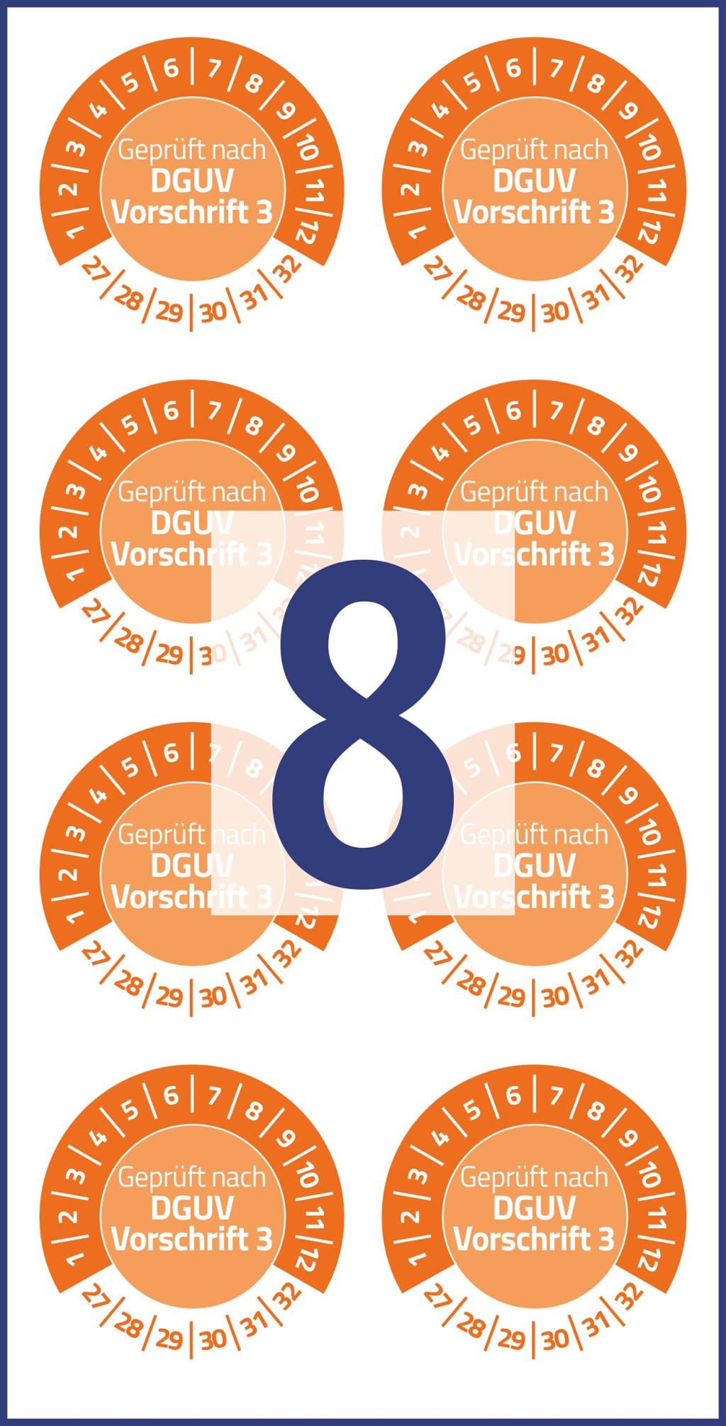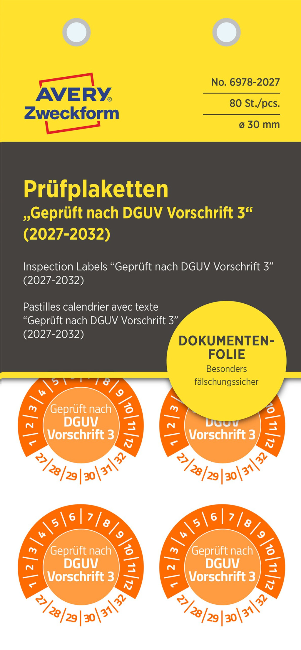 Avery Zweckform No. 6978-2027 narancssárga színű 30 mm átmérőjű öntapadós biztonsági hitelesítő címke 2027-2032-es évszámmal Geprüft nach DGUV Vorschrift 3 felirattal - 80 címke / csomag