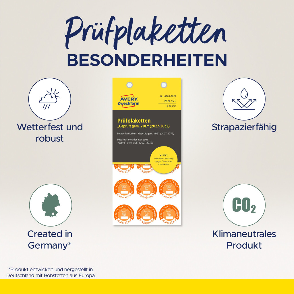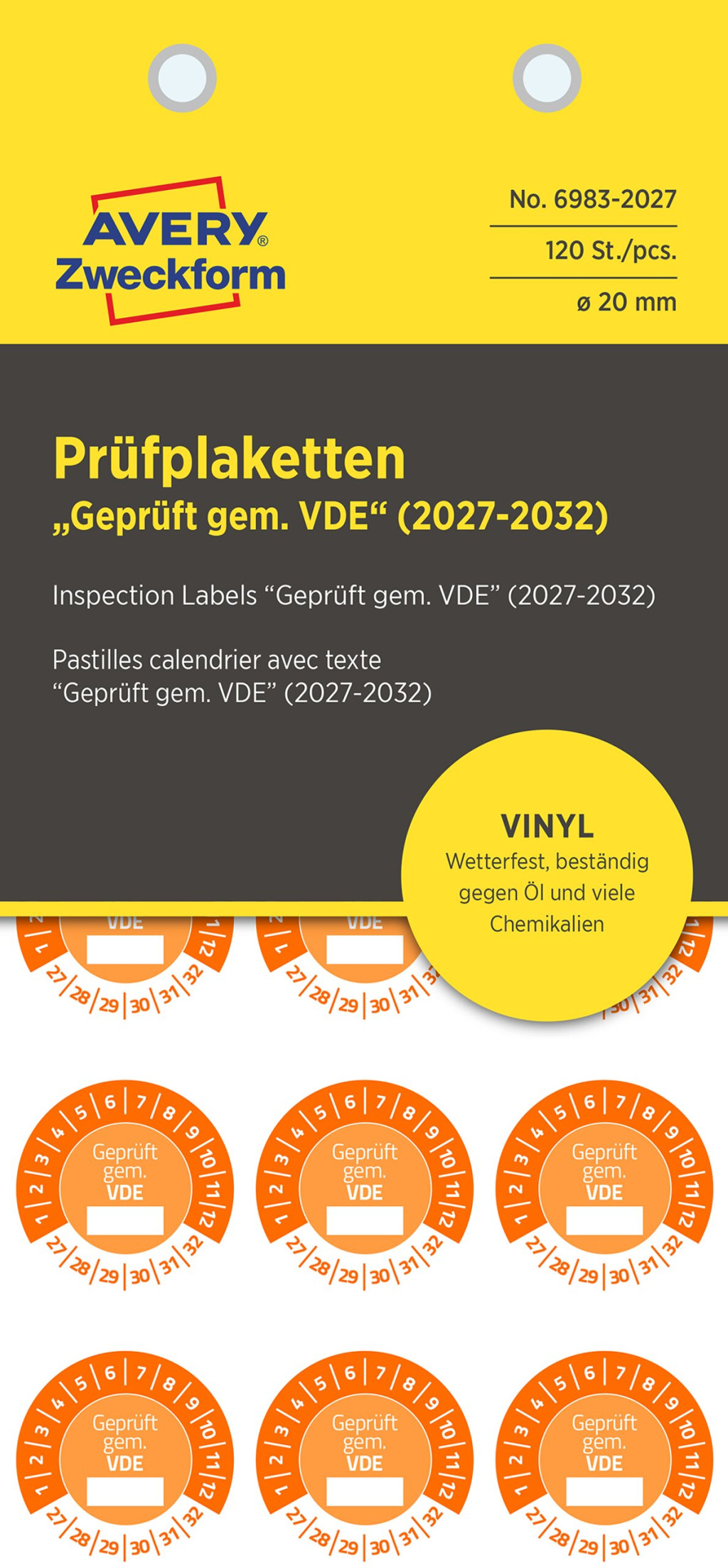 Avery Zweckform No. 6983-2027 narancssárga színű 20 mm átmérőjű öntapadós időjárásálló felülvizsgálati címke 2027-2032-es évszámmal Geprüft gemäß VDE felirattal - 120 címke / csomag