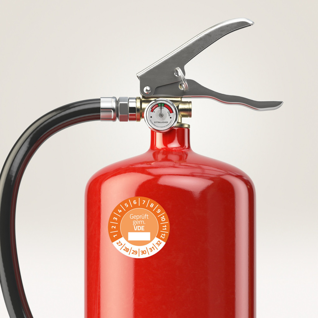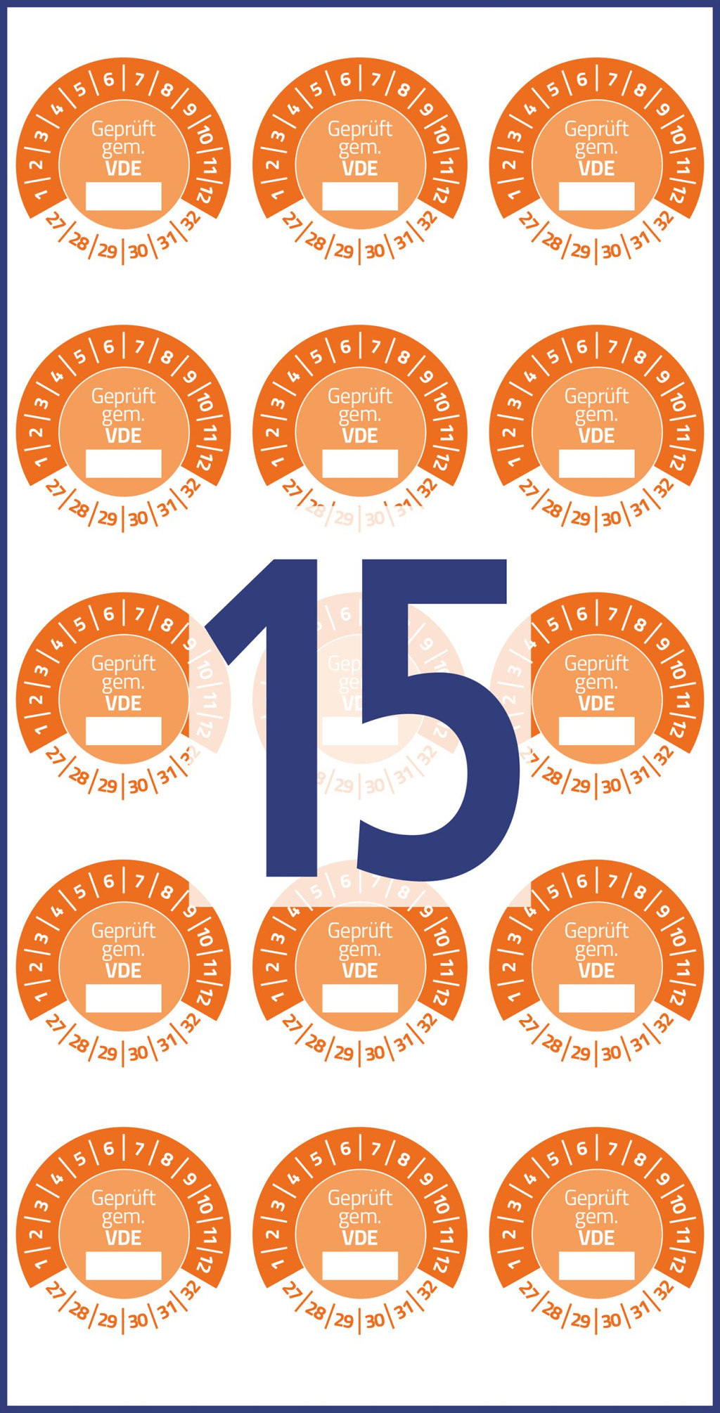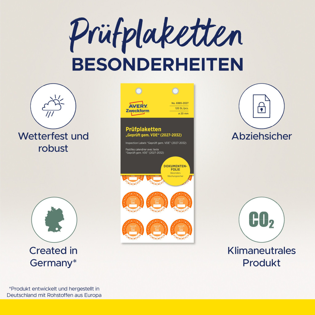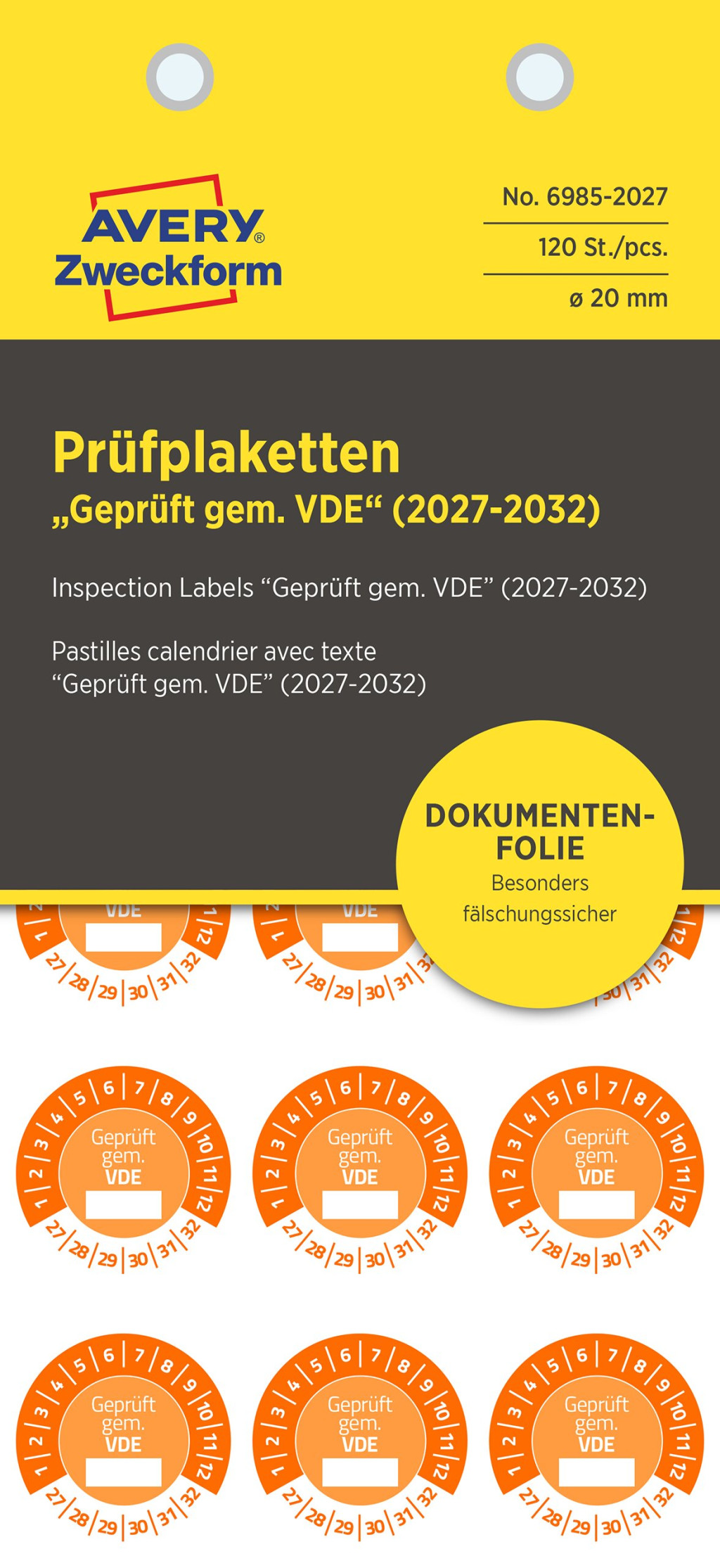 Avery Zweckform No. 6985-2027 narancssárga színű 20 mm átmérőjű öntapadós biztonsági hitelesítő címke 2027-2032-es évszámmal Geprüft gemäß VDE felirattal - 120 címke / csomag