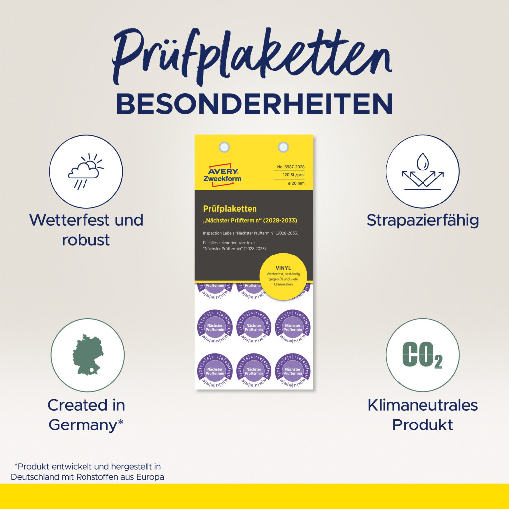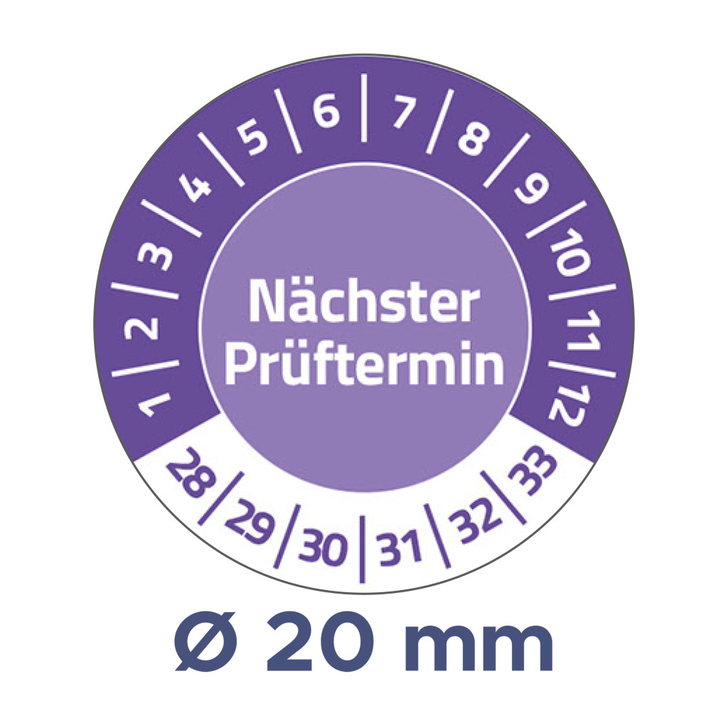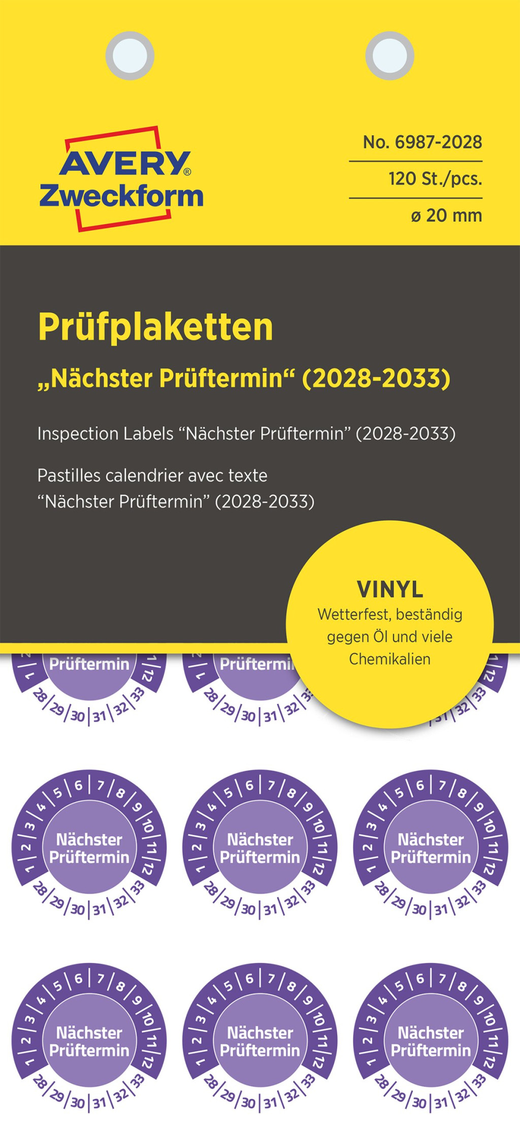 Avery Zweckform No. 6987-2028 ibolyakék színű 20 mm átmérőjű öntapadós időjárásálló felülvizsgálati címke 2028-2033-as évszámmal Nächster Prüftermin felirattal - 120 címke / csomag