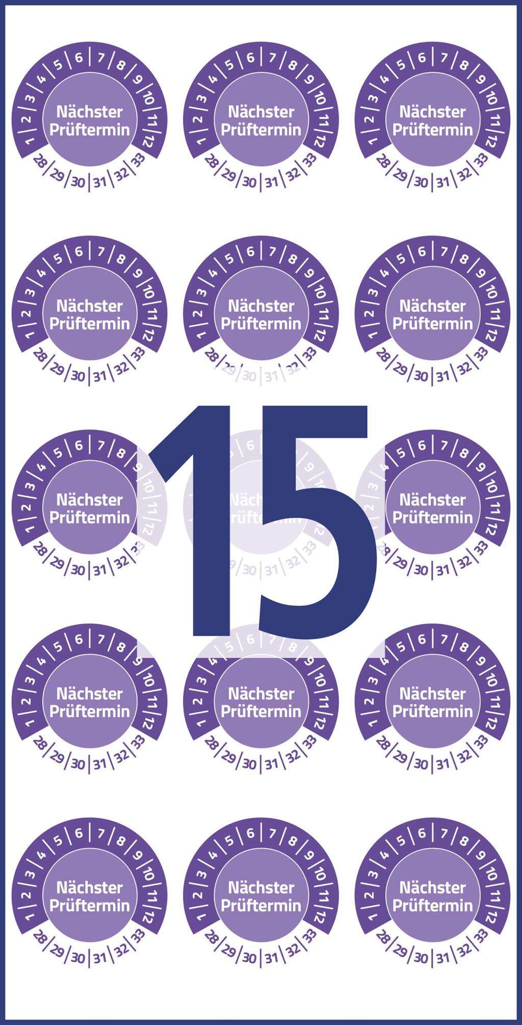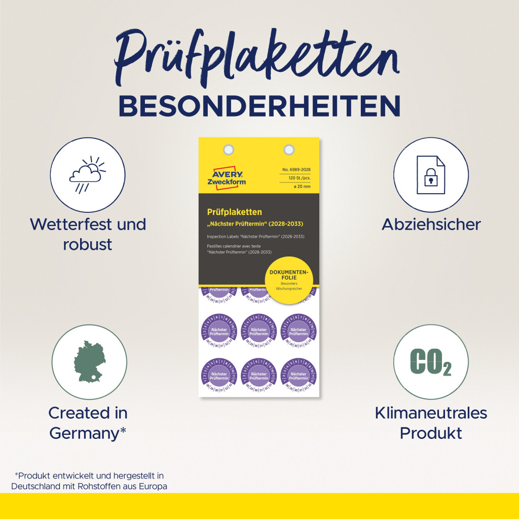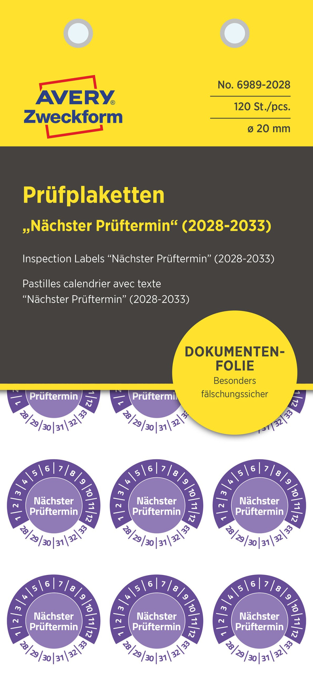 Avery Zweckform No. 6989-2028 ibolyakék színű 20 mm átmérőjű öntapadós biztonsági hitelesítő címke 2028-2033-as évszámmal Nächster Prüftermin felirattal - 120 címke / csomag